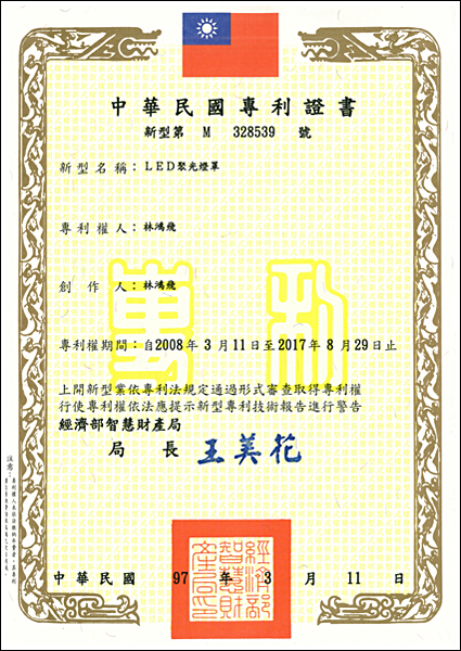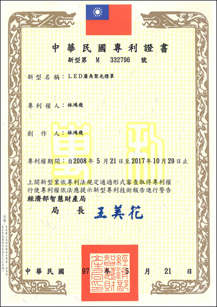 LED廣角聚光燈罩專利認證 |